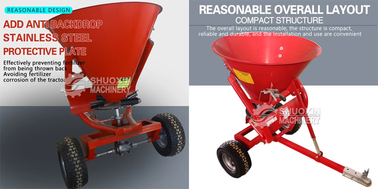 त्याच्या शंकूच्या आकाराचे रचना डिझाइन आणि स्टेप केलेल्या ऑगर ब्लेडसह, ग्रॅन्युलर खते, सेंद्रिय खते आणि खत यासारख्या विविध प्रकारच्या सामग्री प्रभावीपणे हाताळू शकतात. हे डीसिंग एजंट्स देखील पसरवू शकते. क्रशिंगची त्याची एकरूपता आणि डिस्चार्जिंगची गुळगुळीतपणा विविध खतांच्या वैशिष्ट्यांसाठी योग्य आहे. समायोज्य खत डिस्चार्ज पोर्ट्स आणि स्प्रेडिंग डिस्कच्या रोटेशनल गतीसह एकत्रित, हे वेगवेगळ्या कण आकार आणि ओलावाच्या सामग्रीच्या सामग्रीसह त्याची सुसंगतता वाढवते.